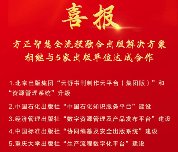 喜報 |“方正智慧全流程融合出版解決方案”相繼與5家出版單位達成合作!